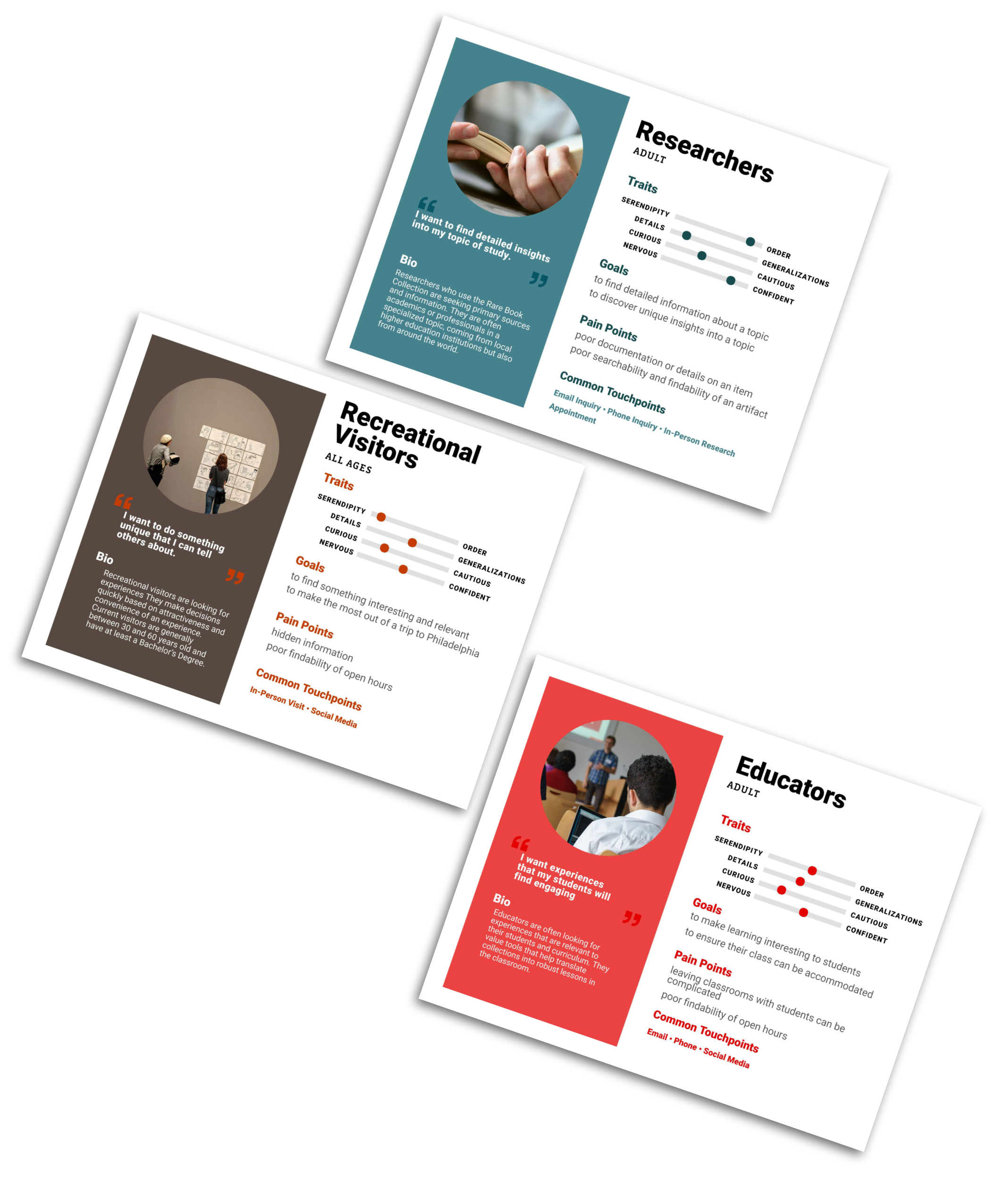 In a 40-minute discussion, I engaged the Special Collections team, asking them to tell me about their experiences engaging with visitors and fielding help desk inquiries. What were their common questions? How did they initiate contact? What were they hoping to achieve? What challenges did they face when serving their audiences, if any?